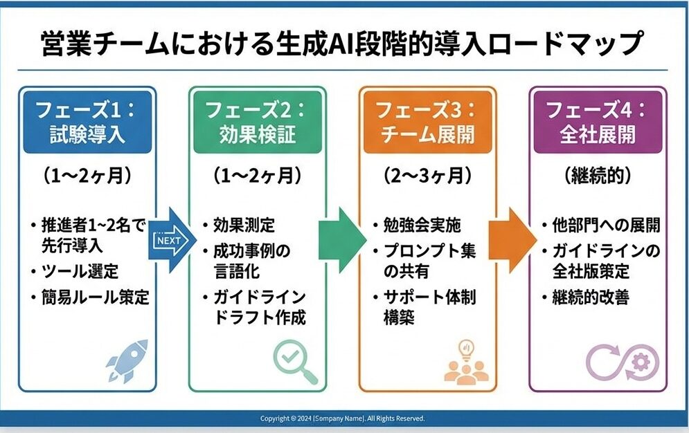 本記事では、営業職における生成AI活用について、基礎知識から具体的なプロンプト、導入ノウハウまで網羅的に解説してきました。