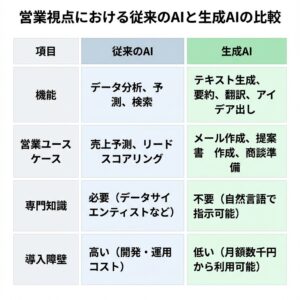 従来のAI(検索エンジンやレコメンドエンジンなど)が「既存の情報を探して表示する」のに対し、生成AIは「新しい文章を作り出す」ことができます。この違いが、営業現場での活用可能性を大きく広げています。