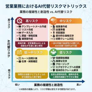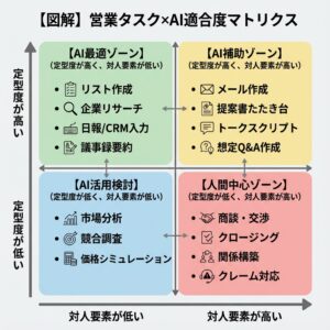 以下のマトリクスは、営業の代表的なタスクを「定型度」と「対人要素」の2軸で分類し、生成AIの適合度を示したものです。