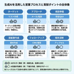 「生成AIが営業に使える」と聞いても、具体的にどの業務でどう活用すればいいのかイメージしづらい方も多いでしょう。